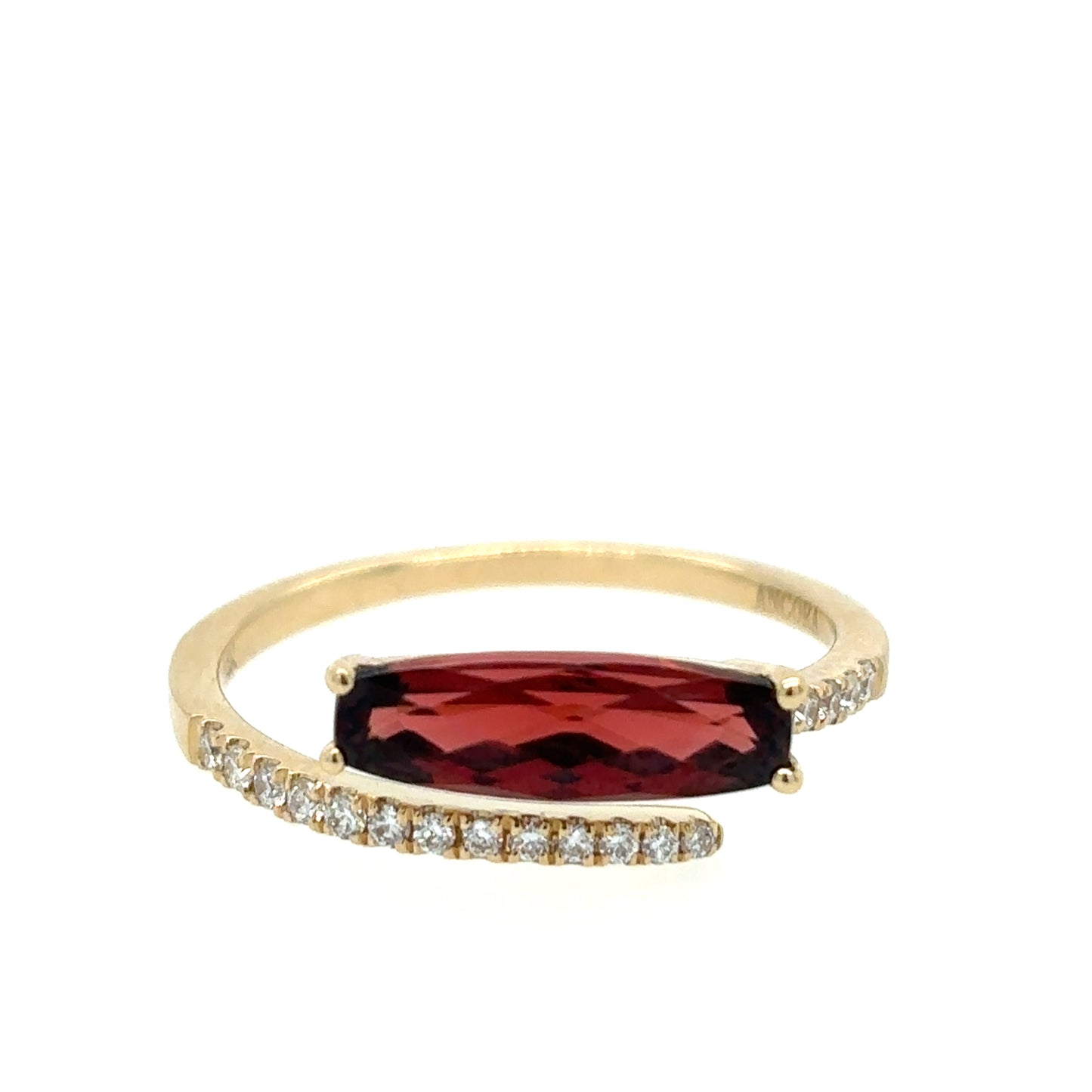 This 14K yellow gold ring hosts a dazzling garnet center stone with a line of diamonds to create a truly unique statement piece that elevates any outfit.