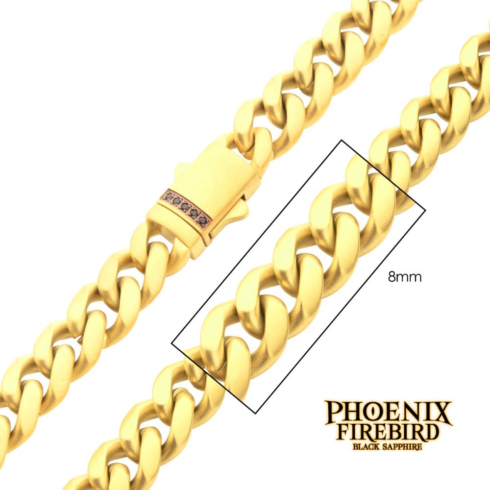 8mm 18Kt Gold IP Steel Matte Finish Miami Cuban Chain Necklace Genuine Black Sapphire