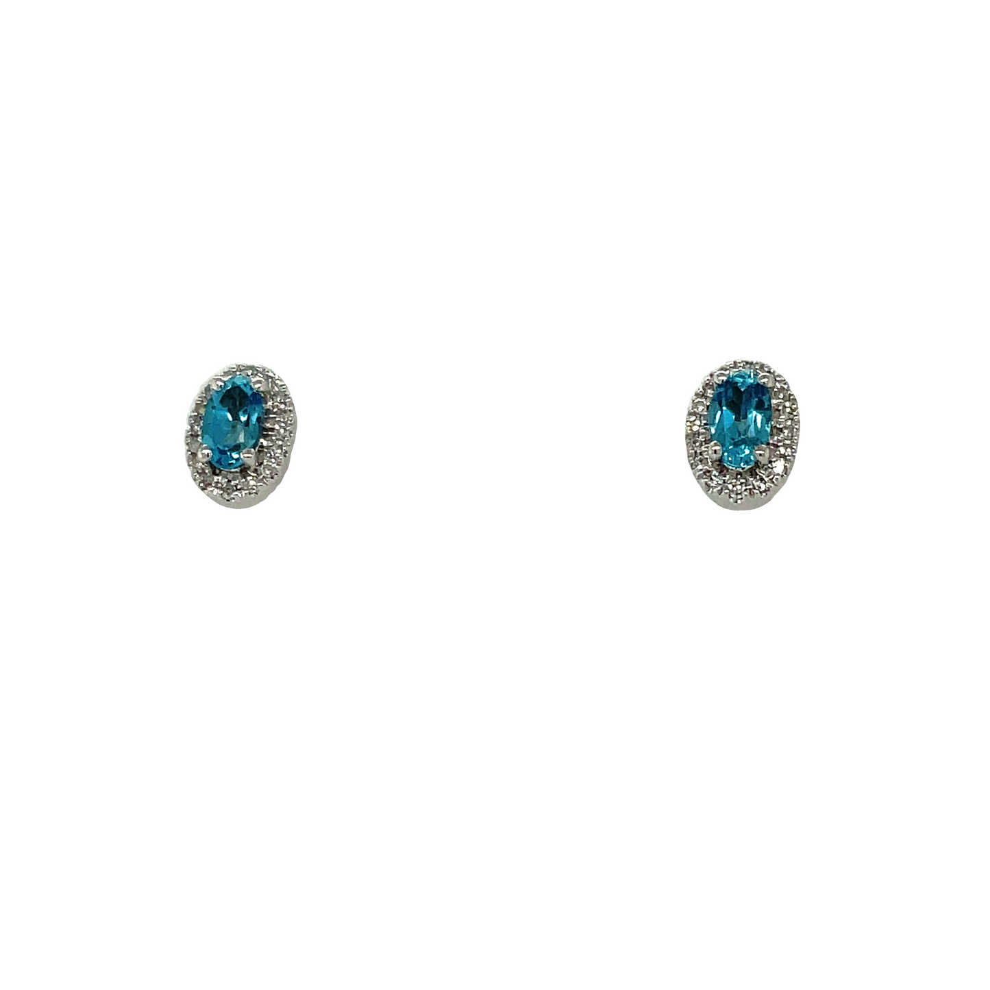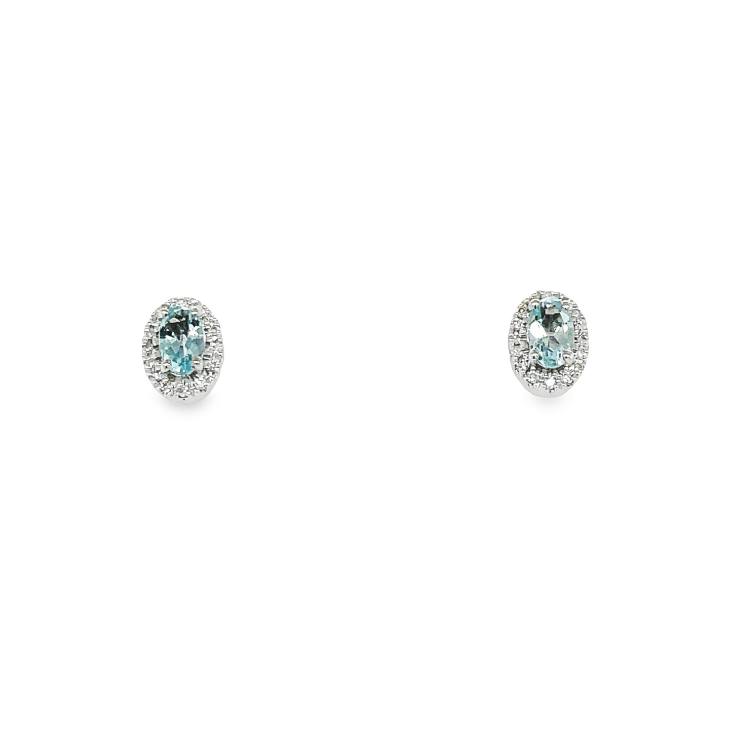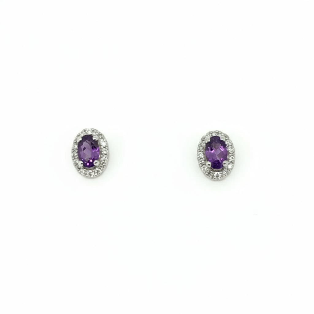Our earring collection hosts a large birthstone center stone with a halo of diamonds set in 10K white gold to create an eye-catching piece.