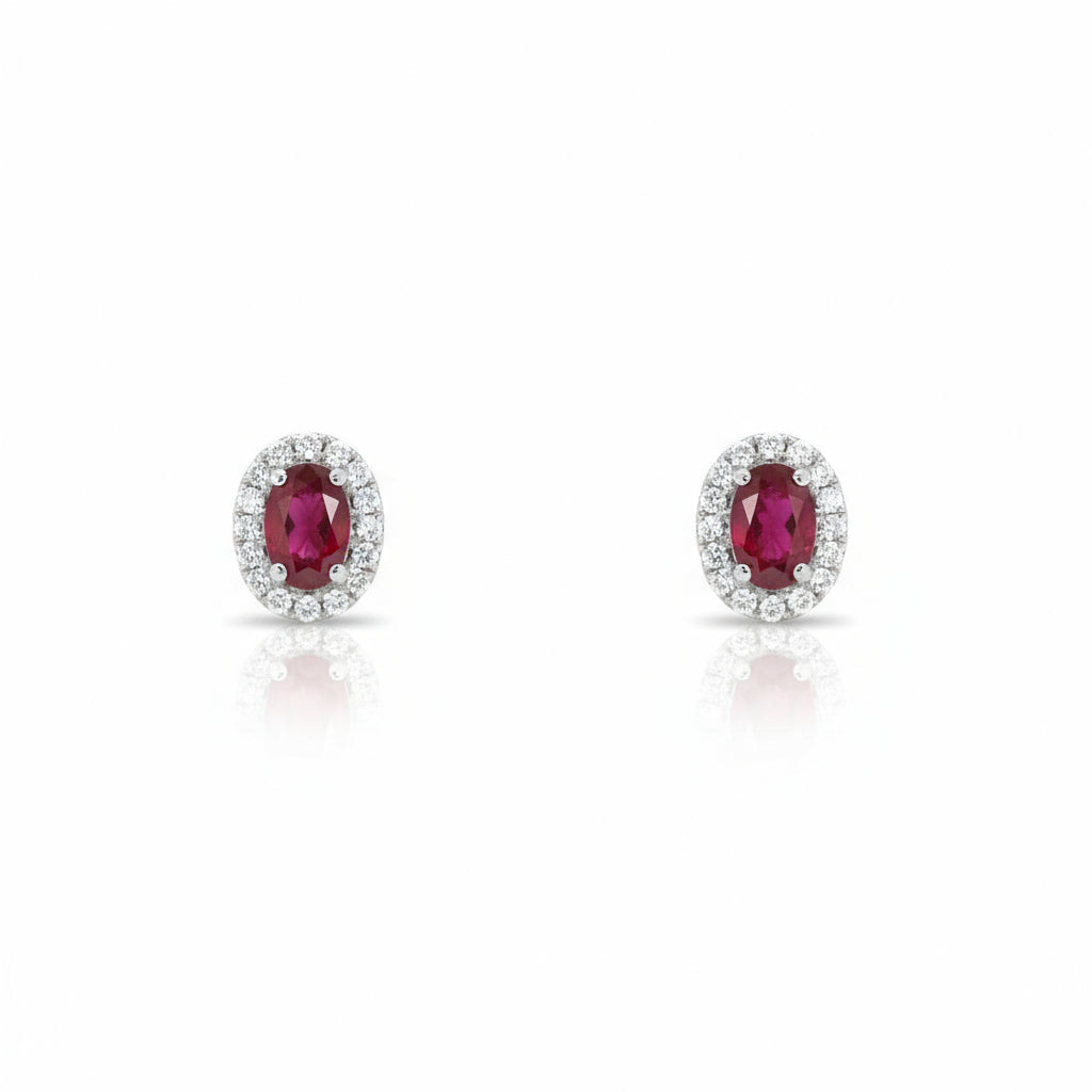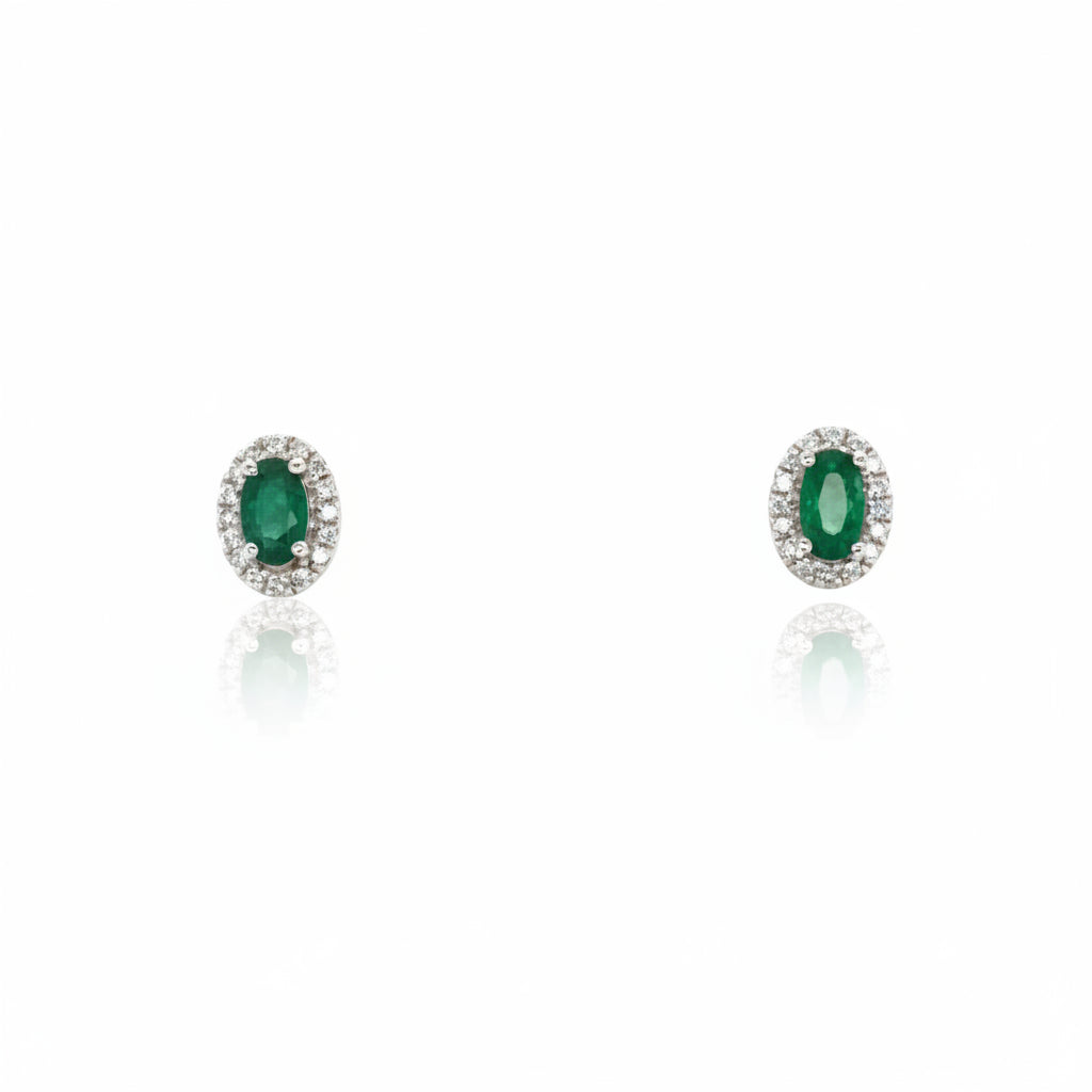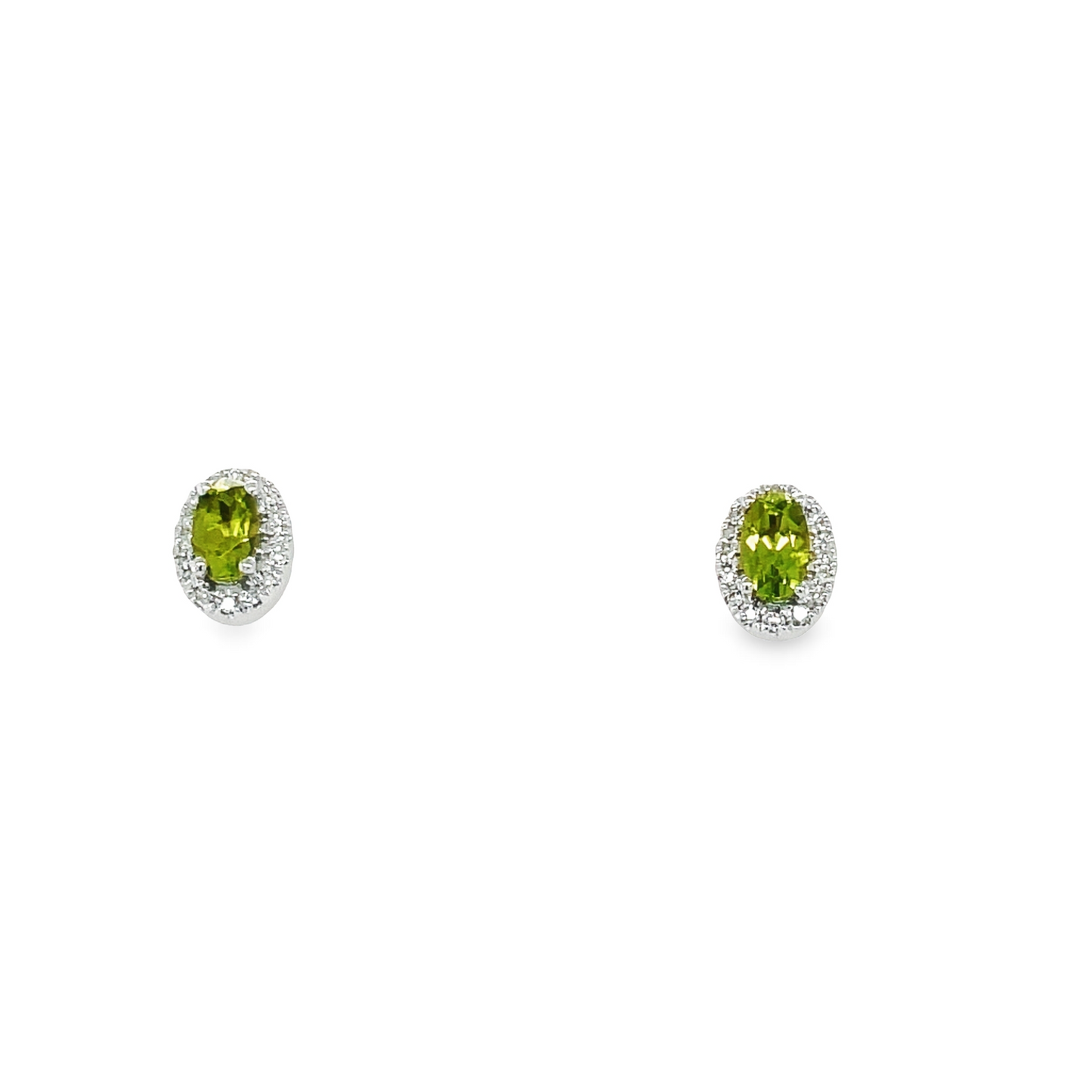 Our earring collection hosts a large birthstone center stone with a halo of diamonds set in 10K white gold to create an eye-catching piece.