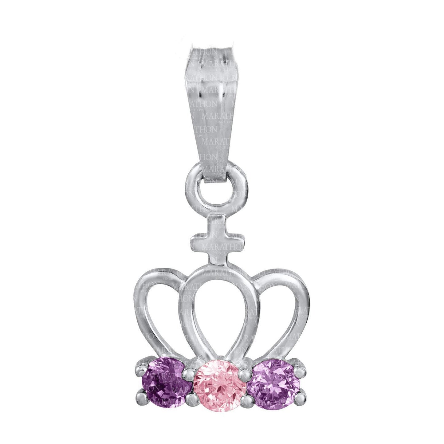 Child's sterling silver crown pendant with purple and pink czs on a 15" chain