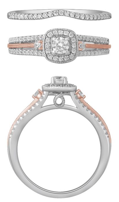 10K White and Rose gold engagement set. The round brilliant center diamond is set in a beautiful rounded square halo mounting with delicate rose gold accents on each side of the band. There are two rows of prong-set diamonds on each side of the rose gold for a delicate, yet sparkling finish. The under carriage has lovely milgrain detailing. A contoured wedding band is included with prong-set diamonds to match the engagement ring. 0.50 carat total weight.