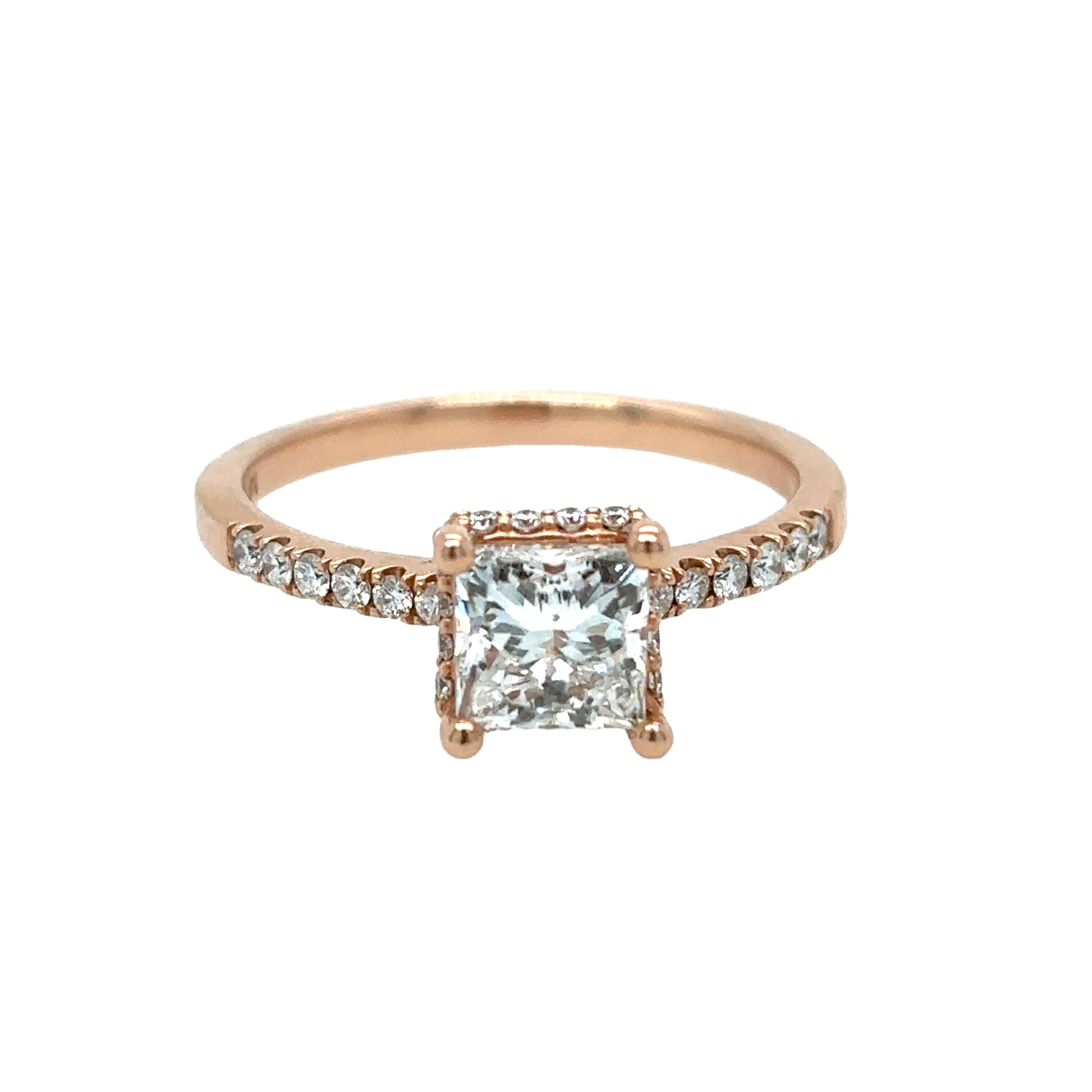A stunning solitaire cushion ring, accentuated by a dazzling array of diamonds. 14K rose gold, 1.24ctw side stones, 1.01ctw center diamond.